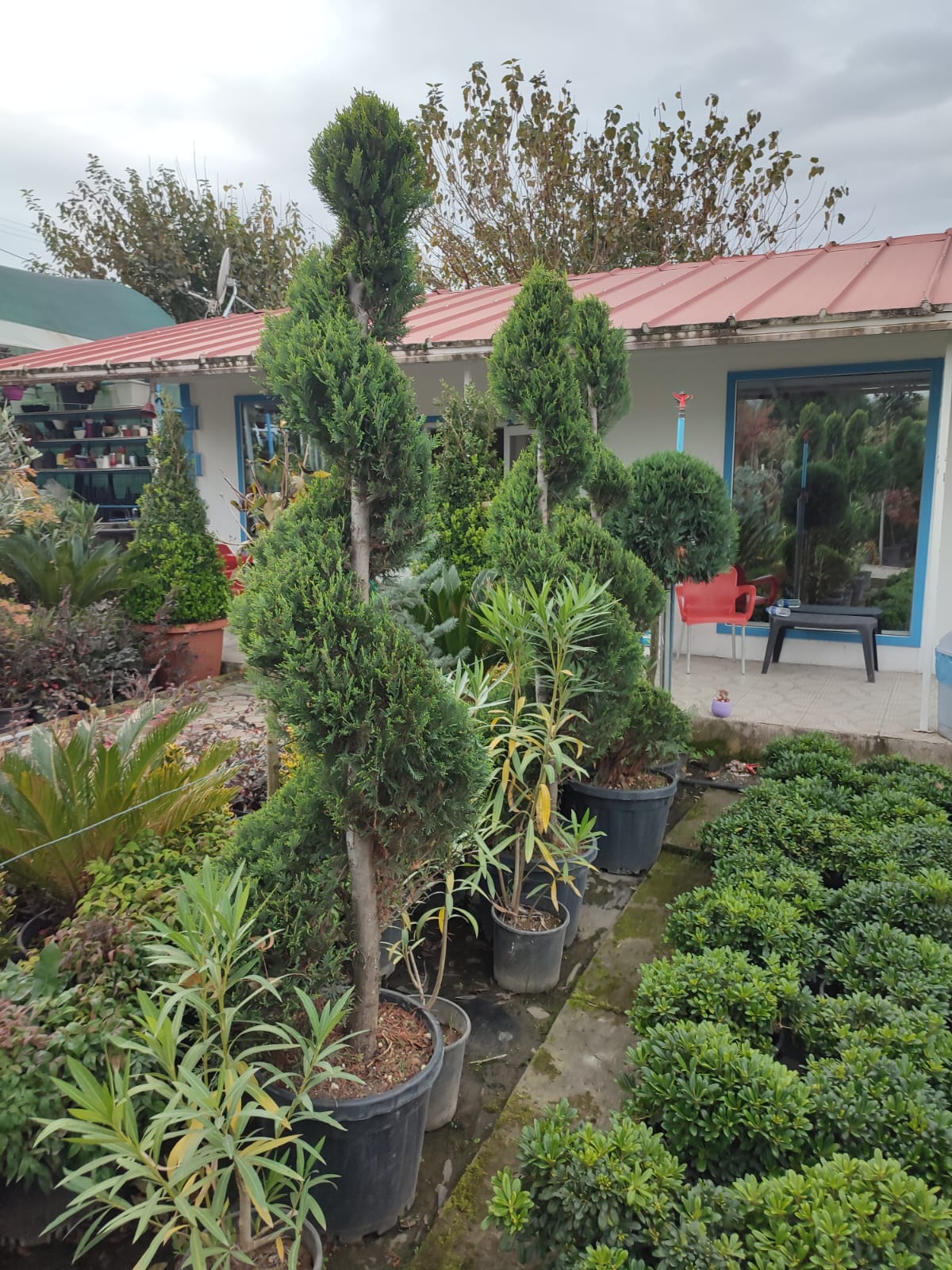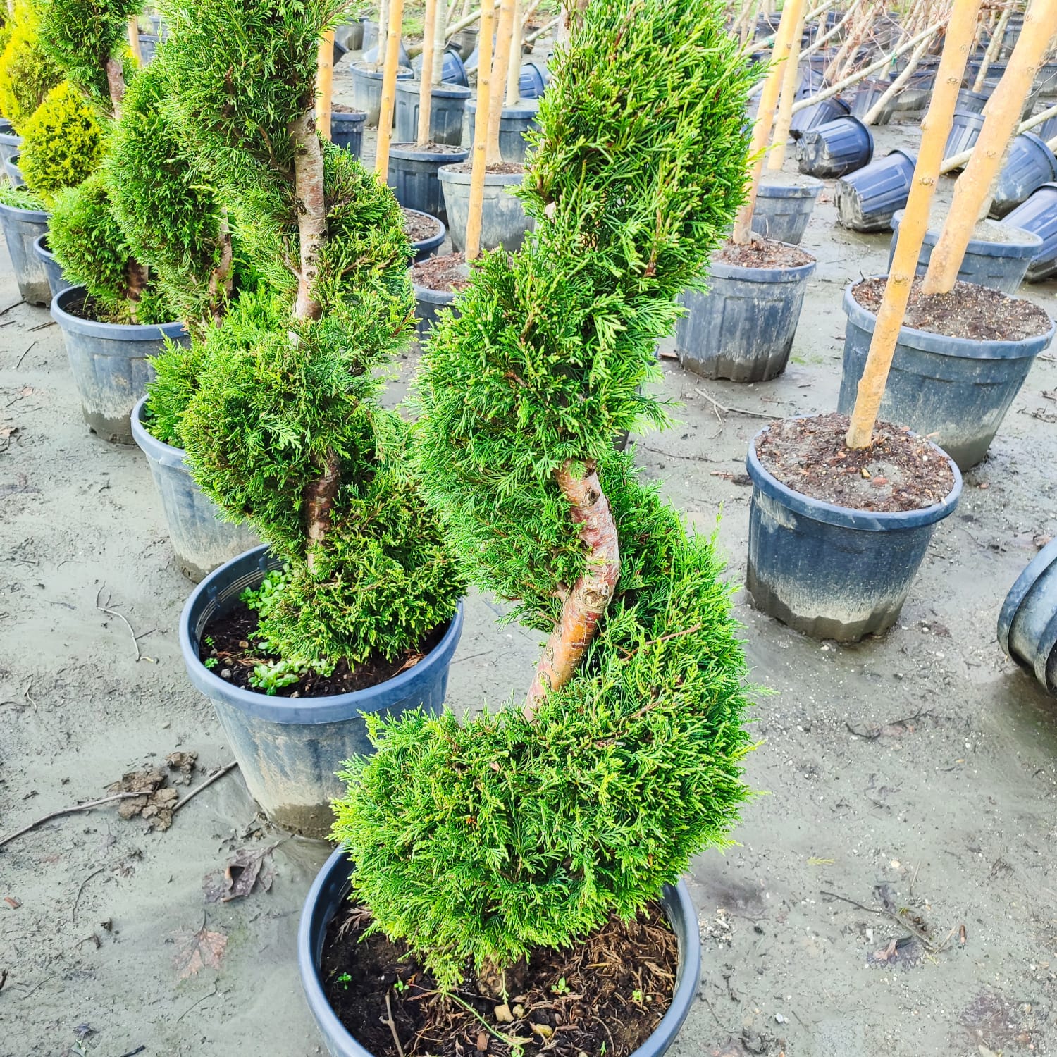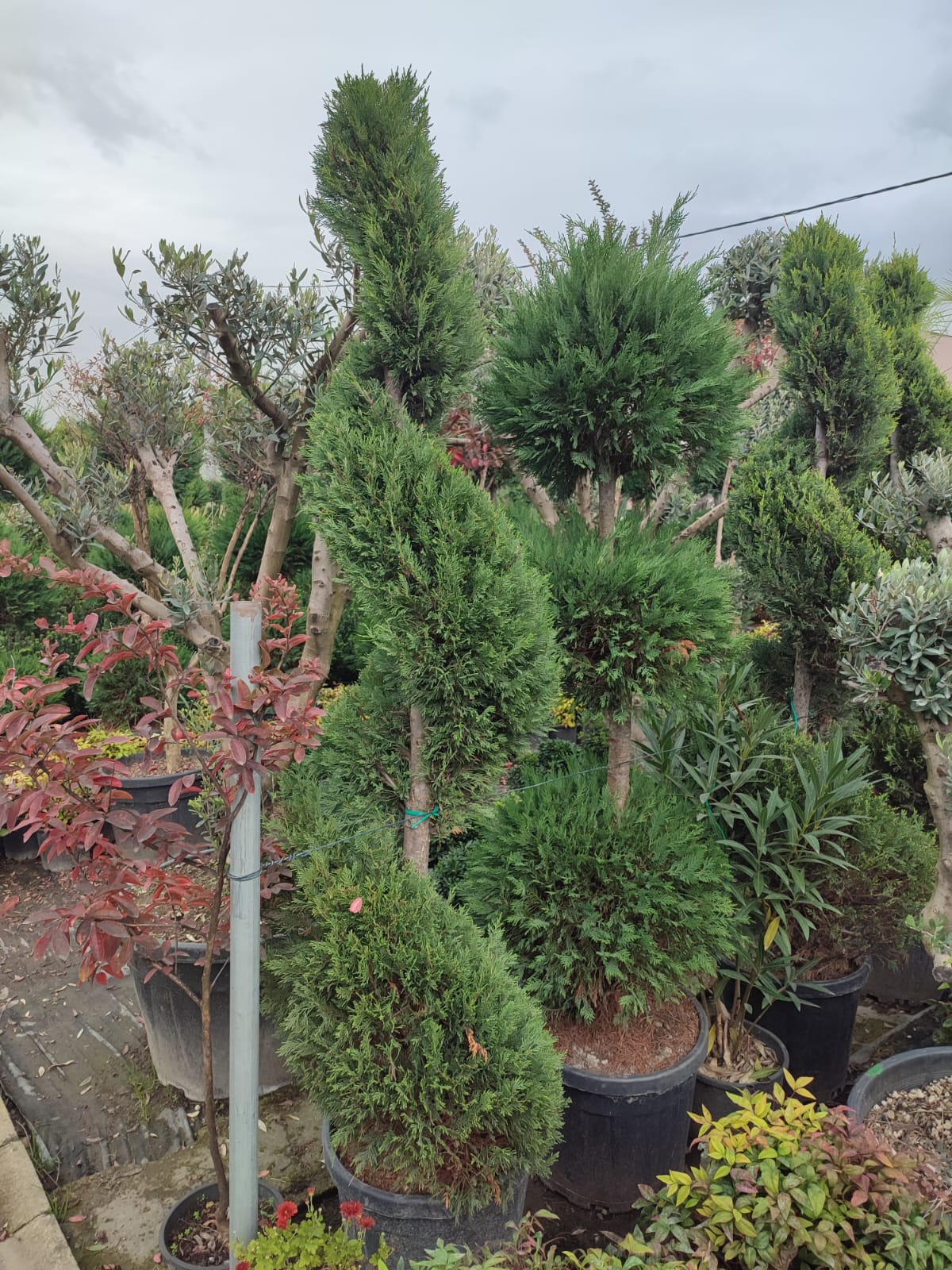 Spiral Leylandi 45 Litrelik saksılarda kıvrımları net ve dolgun 200cm üzeri gövdesi kalın şekilde satıştadır.